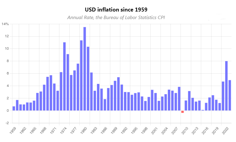 The dollar had an average inflation rate of 3.73% per year between 1959 and today, producing a cumulative price increase of 942.48%.